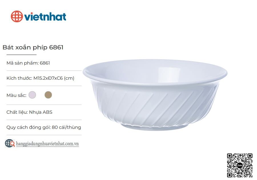 Bát xoắn phíp 1T5-6861 là sản phẩm bát phíp đa năng và tiện ích trong việc phục vụ các món ăn tại gia đình, hàng quán. Bên ngoài sản phẩm có những vân xoắn nổi khối, phần miệng được làm loe rộng tạo điểm nhấn còn trong lòng được làm trơn nhẵn, dễ dàng vệ sinh. Bát xoắn phíp được làm bằng chất liệu nhựa nguyên sinh an toàn, bền bỉ, có khả năng chịu nhiệt tốt, thích hợp để đựng mì, canh, salad, hoặc các món trộn,...