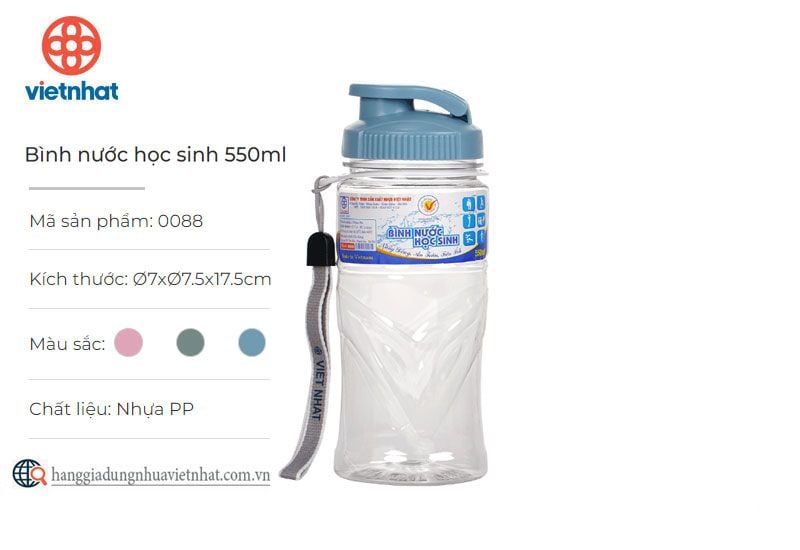 Bình nước 550 nhựa Việt Nhật - Chai nhựa PET an toàn Dùng cho tất các cả mọi người hoạt động thể dục thể thao hay sinh hoạt hàng ngày hay ở nơi làm việc bình nước cá nhân. Dùng cả cho học sinh,sinh viên đem theo đi học. Bình có dây cần và vòi đóng lắp mỗi khi uống xong hợp vệ sinh * Đặc tính sản phẩm: - Chất liệu 100% nhựa PET an toàn - Thiết kế dễ cầm nắm và chống trơn trượt - Có độ trong suốt cao như thủy tinh - Độ bền cao, ít bị trầy xước - Chịu được nhiệt độ từ 20-80 độ C - Thiết kế tiện dụng ngay cả với trẻ nhỏ * Lưu ý khi sử dụng: - Tránh tiếp xúc với lửa - Rửa sạch và để khô ngay sau khi sử dụng xong. - Không rửa bằng búi sắt và vật nhọn