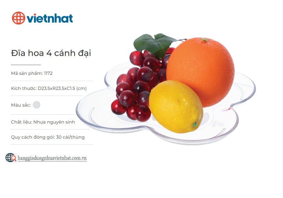 Đĩa hoa 4 cánh đại là sản phẩm đĩa nhựa có thiết kế trong suốt và được cách điệu bằng kiểu dáng bông hoa 4 cánh độc đáo, tạo điểm nhấn sang trọng cho không gian sử dụng. Đĩa hoa 4 cánh được làm từ chất liệu nhựa nguyên sinh đảm bảo an toàn, dày dặn, từng đường nét được hoàn thiện tỉ mỉ, chỉn chu phù hợp để bày biện hoa quả, bánh kẹo đặt bàn ăn vô cùng đẹp mắt.