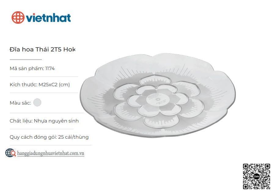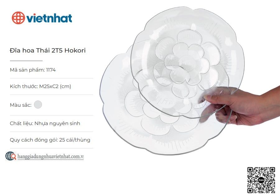 Đĩa hoa Thái Hokori là sản phẩm đĩa nhựa cao cấp có thiết kế trong suốt với hoạ tiết hình bông hoa tạo điểm nhấn sang trọng, tinh tế. Sản phẩm sử dụng chất liệu nhựa nguyên sinh đảm bảo an toàn, dày dặn, từng đường nét được hoàn thiện tỉ mỉ, chỉn chu phù hợp để bày biện hoa quả, bánh kẹo đặt bàn ăn vô cùng đẹp mắt.