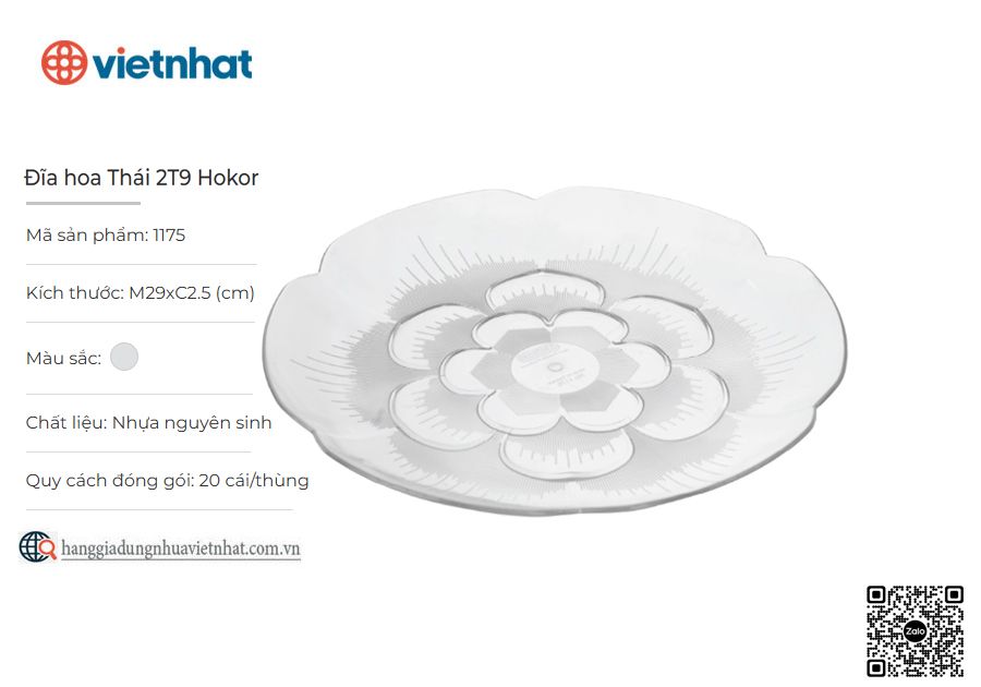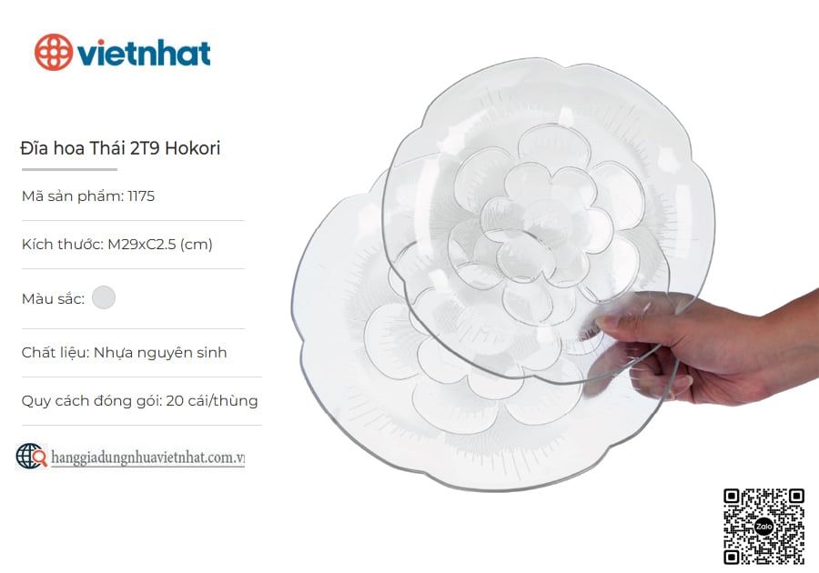 Đĩa hoa Thái Hokori là sản phẩm đĩa nhựa cao cấp có thiết kế trong suốt với hoạ tiết hình bông hoa tạo điểm nhấn sang trọng, tinh tế. Sản phẩm sử dụng chất liệu nhựa nguyên sinh đảm bảo an toàn, dày dặn, từng đường nét được hoàn thiện tỉ mỉ, chỉn chu phù hợp để bày biện hoa quả, bánh kẹo đặt bàn ăn vô cùng đẹp mắt.