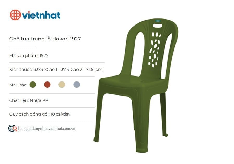 Ghế tựa là mẫu ghế ngồi cao cấp thích hợp sử dụng tại nhiều không gian gia đình, hàng quán. Sản phẩm có thiết kế tựa lưng vững chãi với nhiều lỗ thoáng khí kết hợp mặt ghế có độ võng phù hợp giúp gia tăng sự thoải mái khi ngồi. Đặc biệt, ghế tựa đại lỗ Hokori được làm bằng chất liệu nhựa PP an toàn, chịu được mưa nắng, hạn chế bạc màu và cực kỳ chắc chắn.