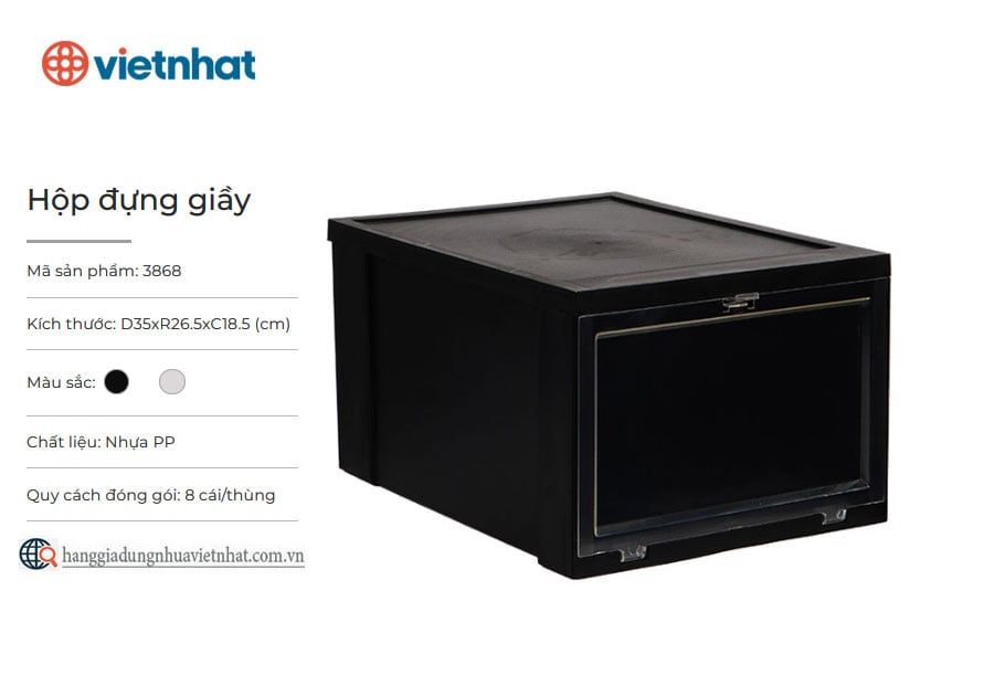 - Chất liệu nhựa PP nguyên sinh an toàn, có độ bền cao. - Nắp mở trong suốt, dễ dàng đóng mở để tìm kiếm giày dép. - Thiết kế gọn nhẹ, khớp nối chắc chắn, dễ dàng lắp ráp tại nhà. - Sản phẩm hình hộp chữ nhật có thể xếp chồng tiện lợi, tiết kiệm không gian sử dụng. - Kích thước tối ưu với chiều dài 35cm, chiều rộng 26,5cm và chiều cao 19cm giúp đựng nhiều loại giày khác nhau. - Bề mặt trơn bóng dễ dàng vệ sinh - Gam màu đen, trắng sang trọng, hiện đại, phù hợp với nhiều không gian nội thất.