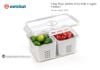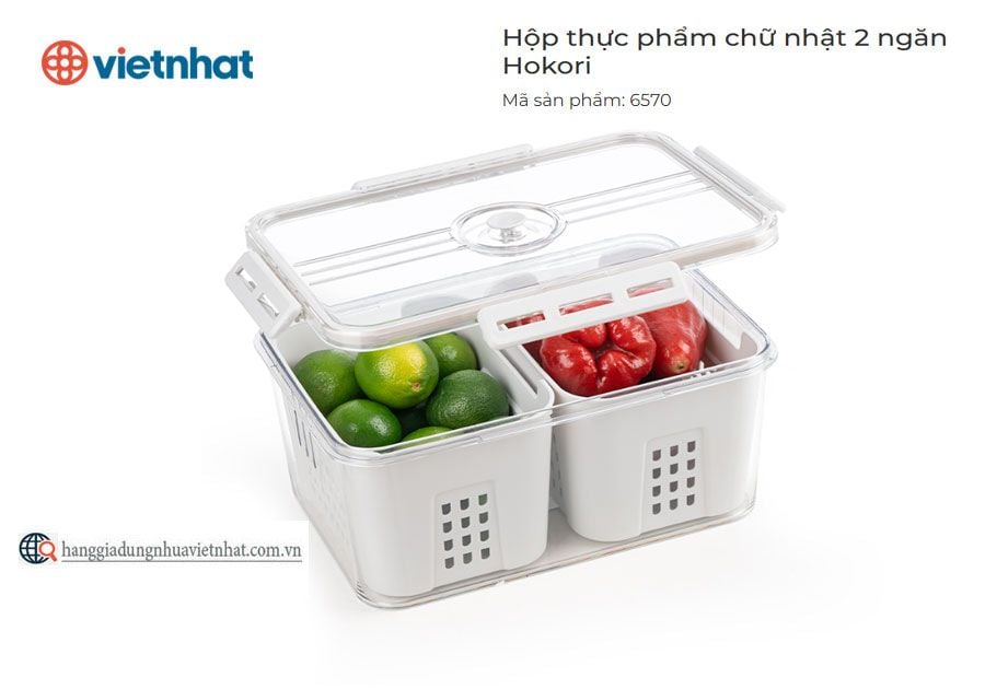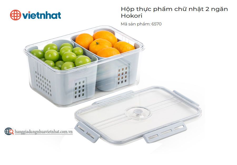 Hộp thực phẩm chữ nhật 2 ngăn Hokori 6570 được thiết kế thông minh với lớp ngoài trong suốt như thuỷ tinh, cùng 2 ngăn di động bên trong có lỗ tròn tách nước, giúp phân loại và bảo quản thực phẩm tiện lợi. Nắp hộp có gioăng cao su hoàn toàn kín khí cùng nắp cài có khóa chống thoát hơi ra ngoài gây mùi tủ lạnh. Sở hữu phong cách hiện đại, chiếc hộp lạnh đa năng, tiện lợi này chắc chắn là một trong những món đồ không thể thiếu giúp “hô biến” không gian bếp và tủ lạnh mọi nhà thêm phần gọn gàng, ngăn nắp. Sản phẩm có khả năng chịu nhiệt an toàn từ 0℃ đến 60℃