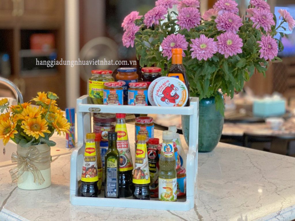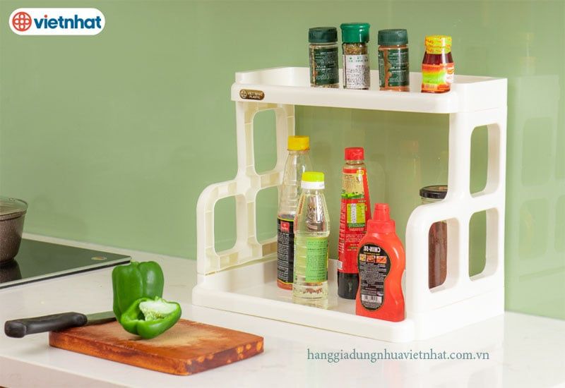 MÔ TẢ SẢN PHẨM: Kệ để đồ nhà bếp 2 tầng nhựa Việt Nhật Kệ gia vị chữ H Nhà bếp là nơi chứa khá nhiều vật dụng khác nhau như các loại chai lọ gia vị, mắm muối,