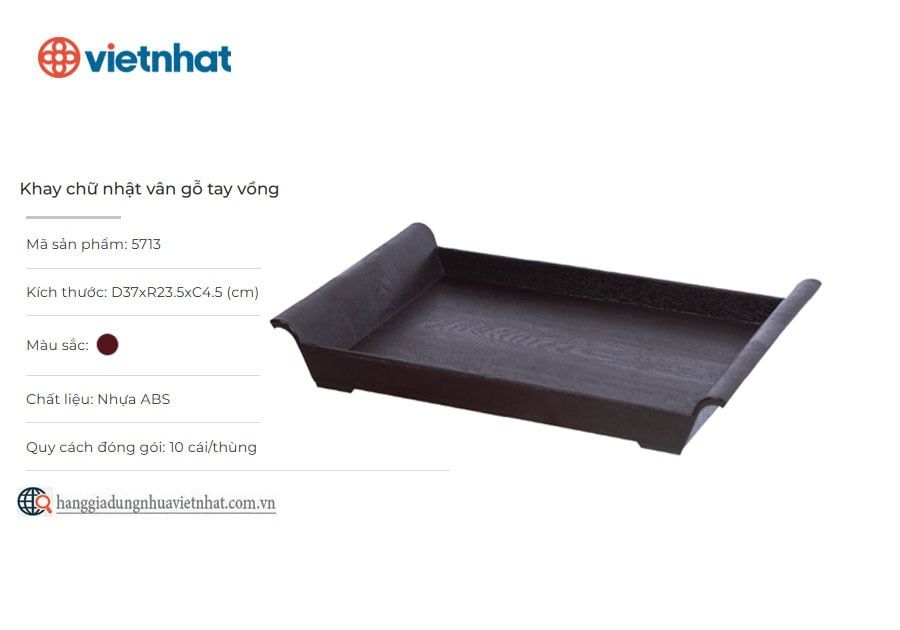 Khay chữ nhật vân gỗ tay vồng 5713 là khay đựng đồ đa năng đựng đồ uống, món ăn một cách chuyên nghiệp tại mọi gia đình, hàng quán kinh doanh. Sản phẩm được làm bằng nhựa ABS có độ bền cao, không lo rơi vỡ. Đặc biệt, mặt khay có hoạ tiết vân gỗ sang trọng, hạn chế trơn trượt hiệu quả cùng thiết kế tay vồng 2 bên giúp di chuyển đồ ăn, nước uống an toàn, không lo tràn đổ.