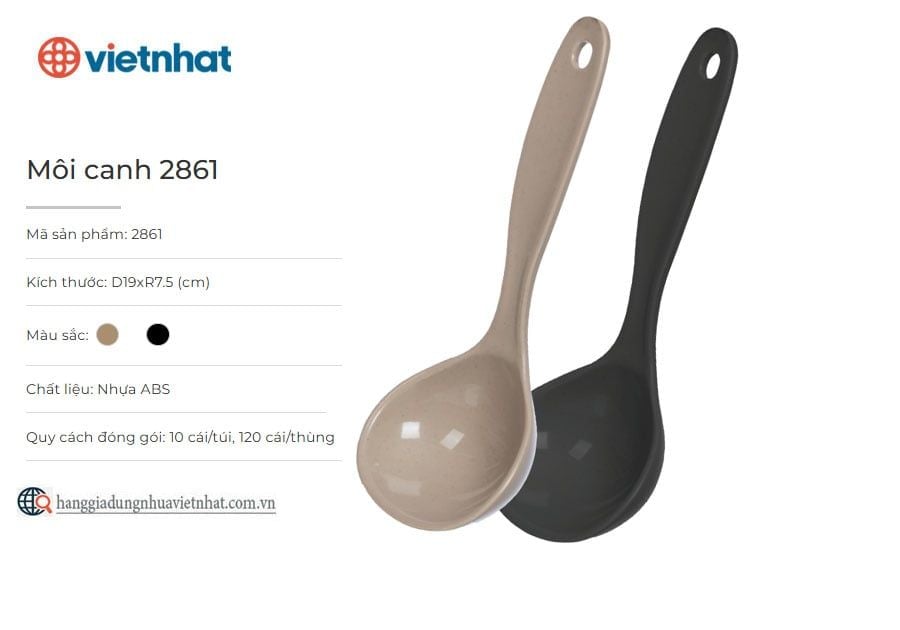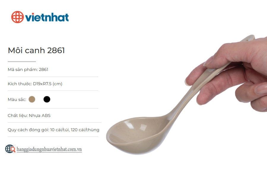 Môi canh 2861 là sản phẩm dùng để múc canh, cháo, súp và các món ăn dạng lỏng. Sản phẩm được làm từ chất liệu nhựa ABS nguyên sinh đảm bảo an toàn, bền bỉ, có khả năng chịu nhiệt tốt. Đặc biệt, môi có thiết kế lòng sâu giúp múc canh dễ dàng hơn, cùng bề mặt trơn nhẵn thuận tiện vệ sinh sau khi sử dụng.
