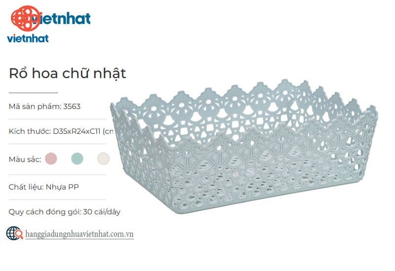 Rổ hoa chữ nhật là sản phẩm đựng đồ đa năng có thiết kế hiện đại với thành rổ được cách điệu bằng họa tiết hoa trang nhã, kết hợp với thân và đáy rổ được hoàn thiện tỉ mỉ, cứng cáp với kiểu dáng lưới thoáng khí, giúp sản phẩm vừa đẹp mắt vừa đảm bảo tính ứng dụng cao. Mang thiết kế đơn giản nhưng không kém phần sang trọng, rổ hoa chữ nhật dễ dàng “biến hóa” để đáp ứng mọi nhu cầu lưu trữ như đựng rau củ, hoa quả, bánh kẹo, gia vị nhà bếp, vật dụng cá nhân,... gọn gàng, ngăn nắp.