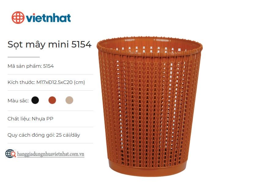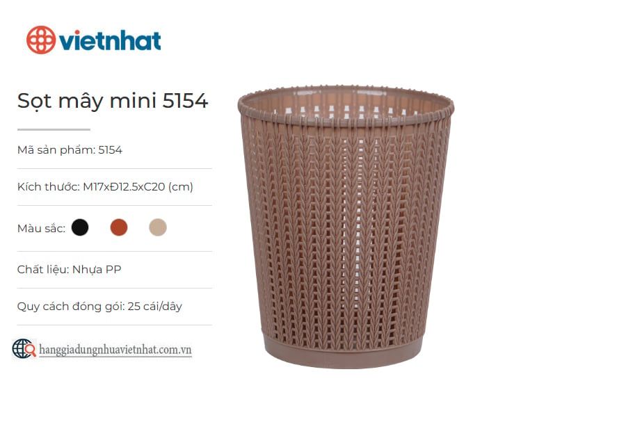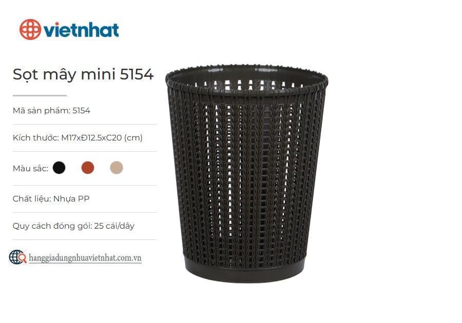 Sọt mây mini 5154 là sọt đựng rác tiện ích phù hợp với nhiều phong cách nội thất trong gia đình, văn phòng, nhà hàng, khách sạn,… Sọt mây mini được làm từ chất liệu nhựa PP an toàn, dày dặn và bền chắc. Ngoài thiết kế nhỏ gọn, tiện dụng, sản phẩm còn góp phần tăng thêm tính thẩm mỹ cho không gian sử dụng bởi họa tiết đan mây đẹp mắt cùng nhiều màu sắc nhã nhặn, hiện đại.