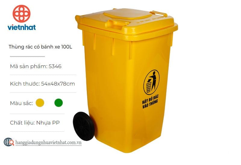 Thùng rác có bánh xe Việt Nhật là mẫu thùng rác công cộng rất được ưa chuộng và quen thuộc tại các hè phố, công viên, chung cư hay tại các cơ quan, nhà máy, trường học, bệnh viện,… Sản phẩm được làm từ chất liệu nhựa nguyên sinh có độ bền cao, khả năng chịu lực tốt, hạn chế tối đa tình trạng bị bục, thủng đáy khi sử dụng trong thời gian dài. Bên cạnh đó, bề mặt thùng rác được thiết kế trơn nhẵn, dễ dàng vệ sinh, có thể đặt cố định hoặc di chuyển đến nhiều vị trí khác nhau nhờ có bánh xe di chuyển tiện lợi.