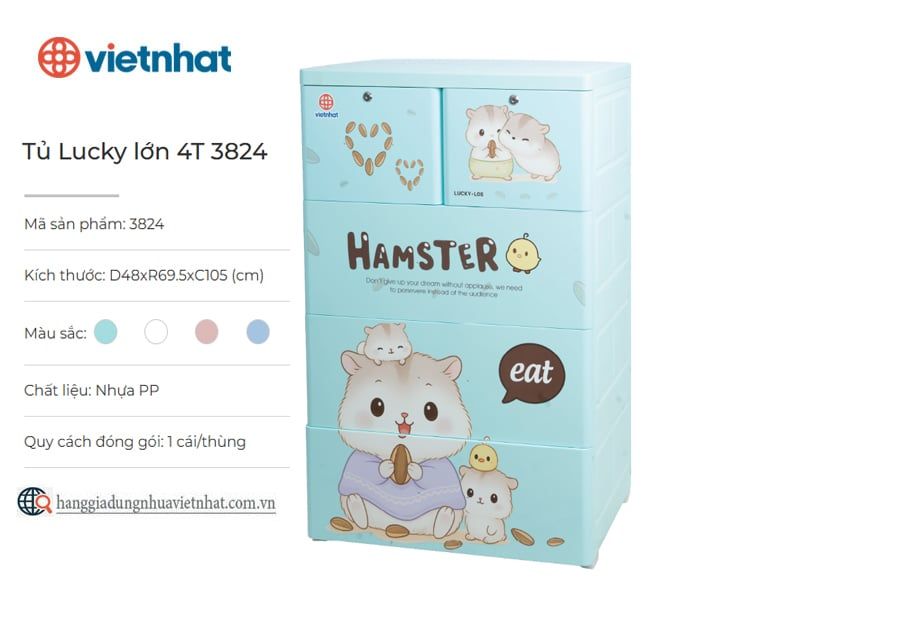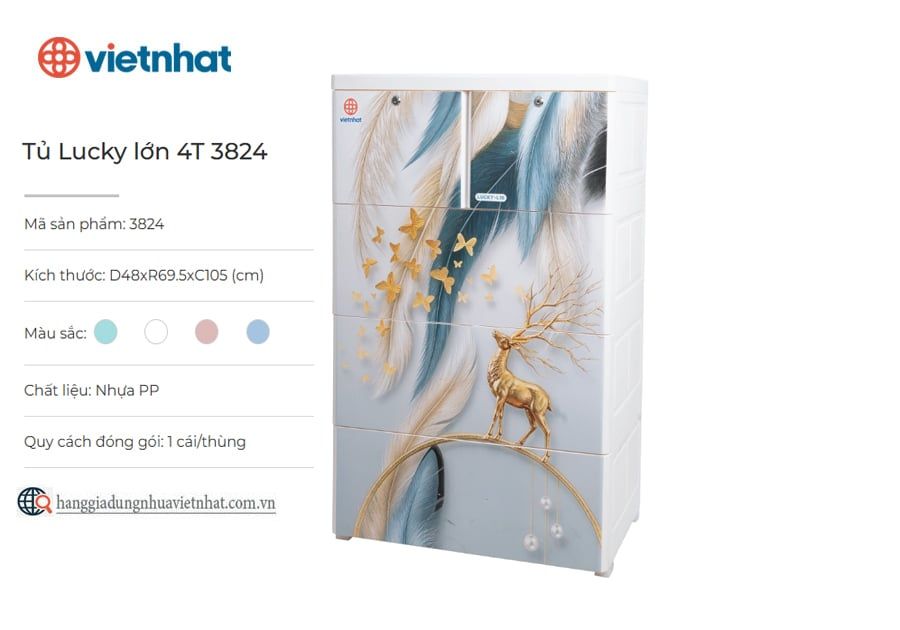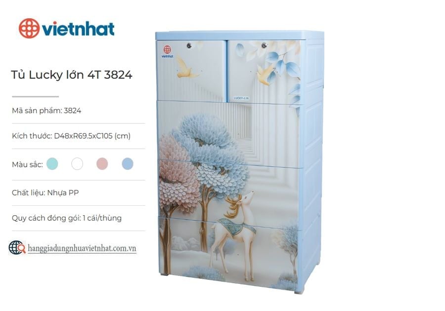 Tủ Lucky lớn 4T 3824 là mẫu tủ nhựa đa năng 4 tầng giúp người dùng dễ dàng phân loại và sắp xếp quần áo, đồ dùng gọn gàng, tiện lợi. Sản phẩm được làm từ nhựa PP an toàn, bền chắc, với các khớp nối được hoàn thiện tỉ mỉ, đảm bảo độ ổn định và khả năng chịu lực tốt. Sở hữu thiết kế hiện đại với nhiều hình in cực bắt mắt, tủ lucky lớn 4T vừa phục vụ nhu cầu lưu trữ vừa góp phần làm không gian sống thêm sinh động.