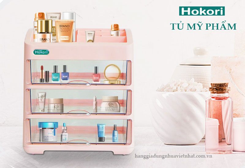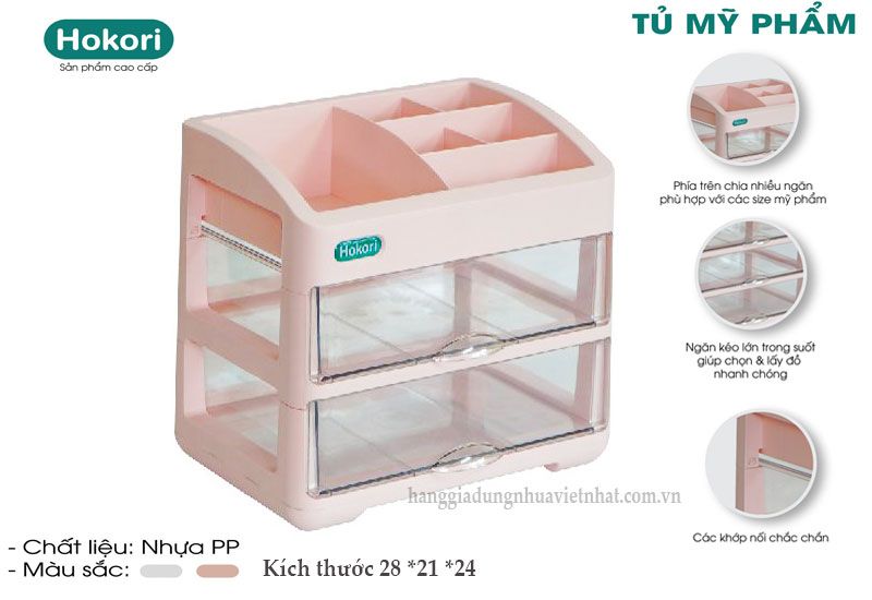 Thiết kế vô cùng tiện dụng bao gồm : các ngăn kéo lớn để bạn đựng đồ dùng , trang sức và đồ trang điểm và ngăn trên cùng được chia 6 ô để bạn tận dụng đựng các loại mỹ phẩm như : nước hoa , son môi ....
